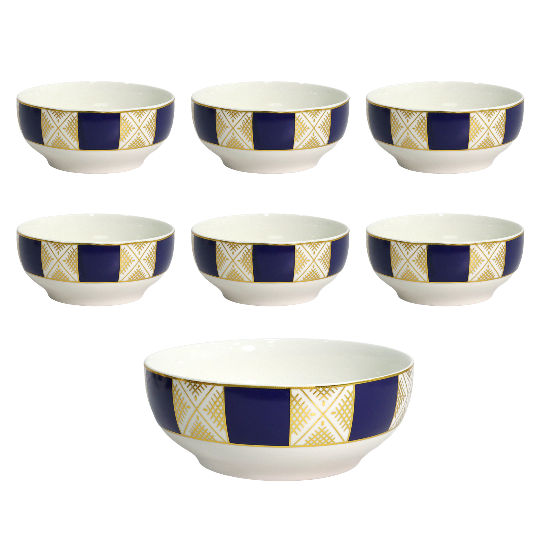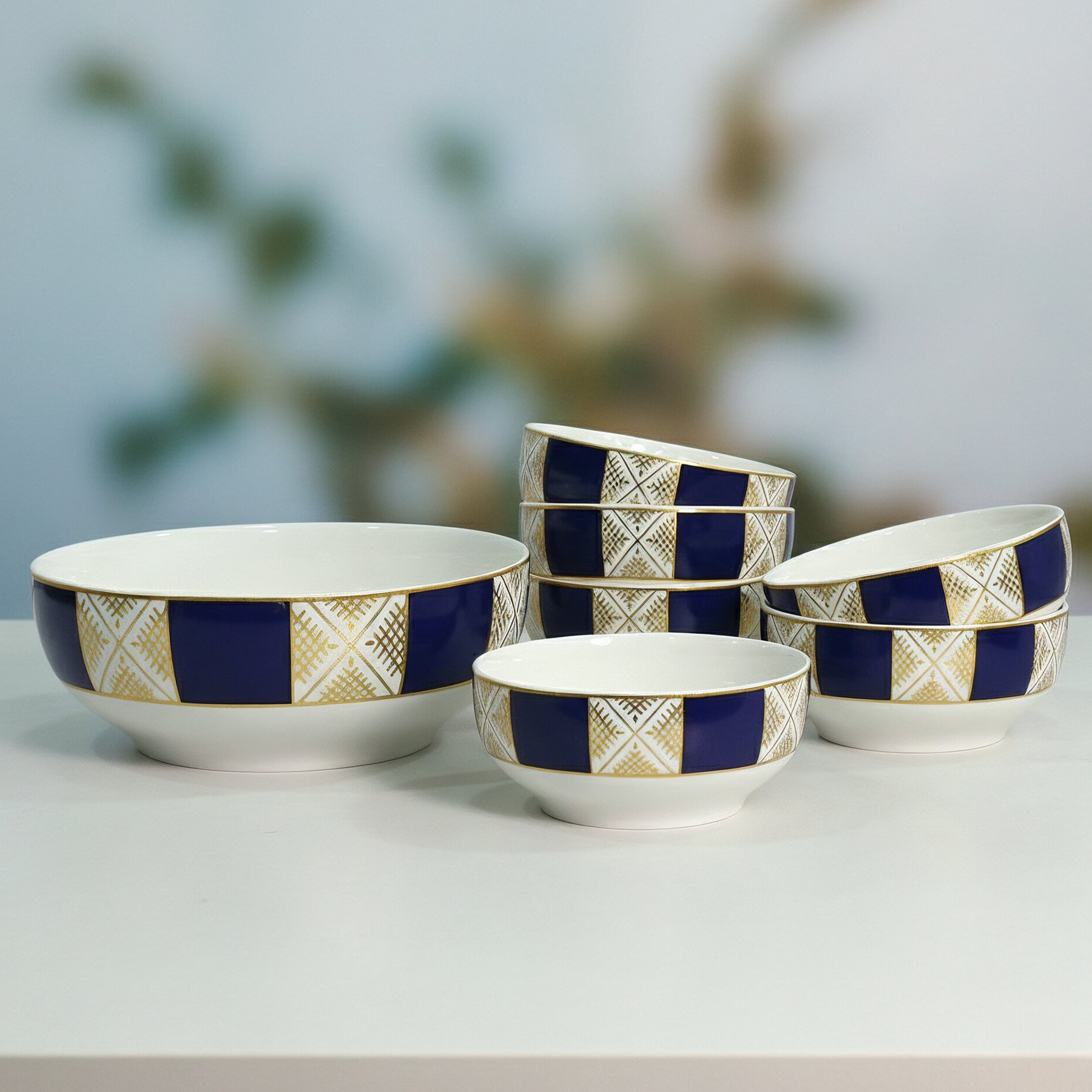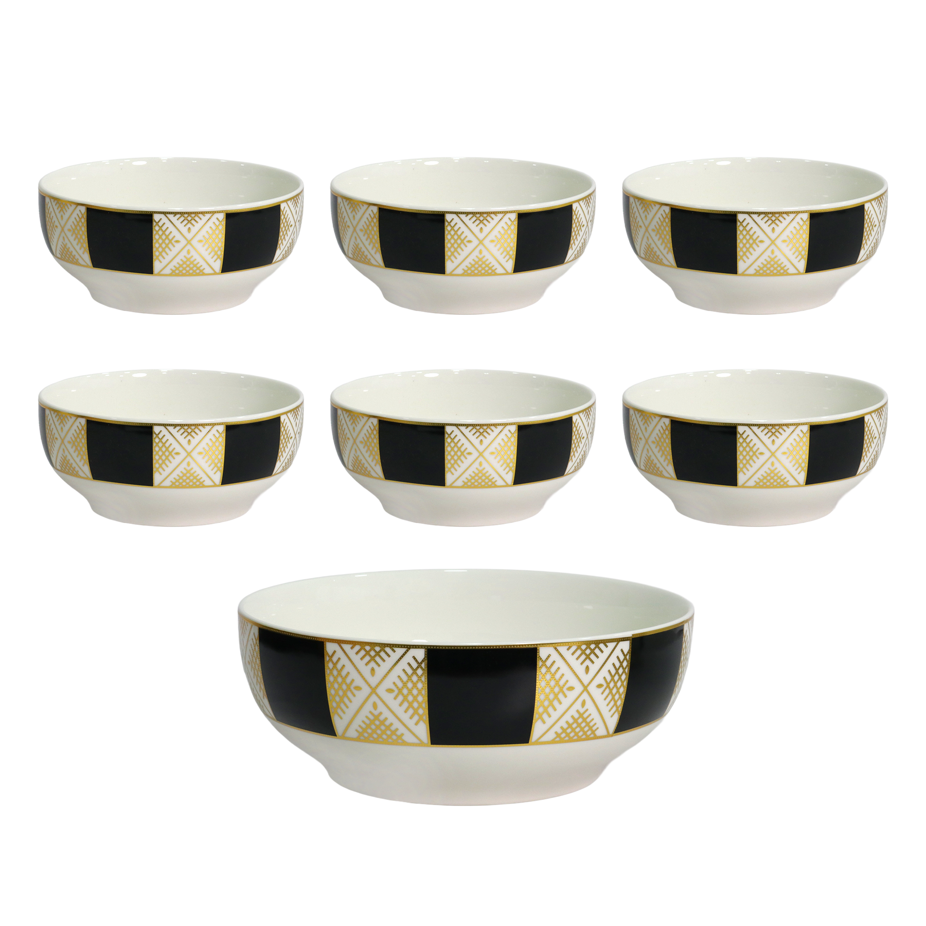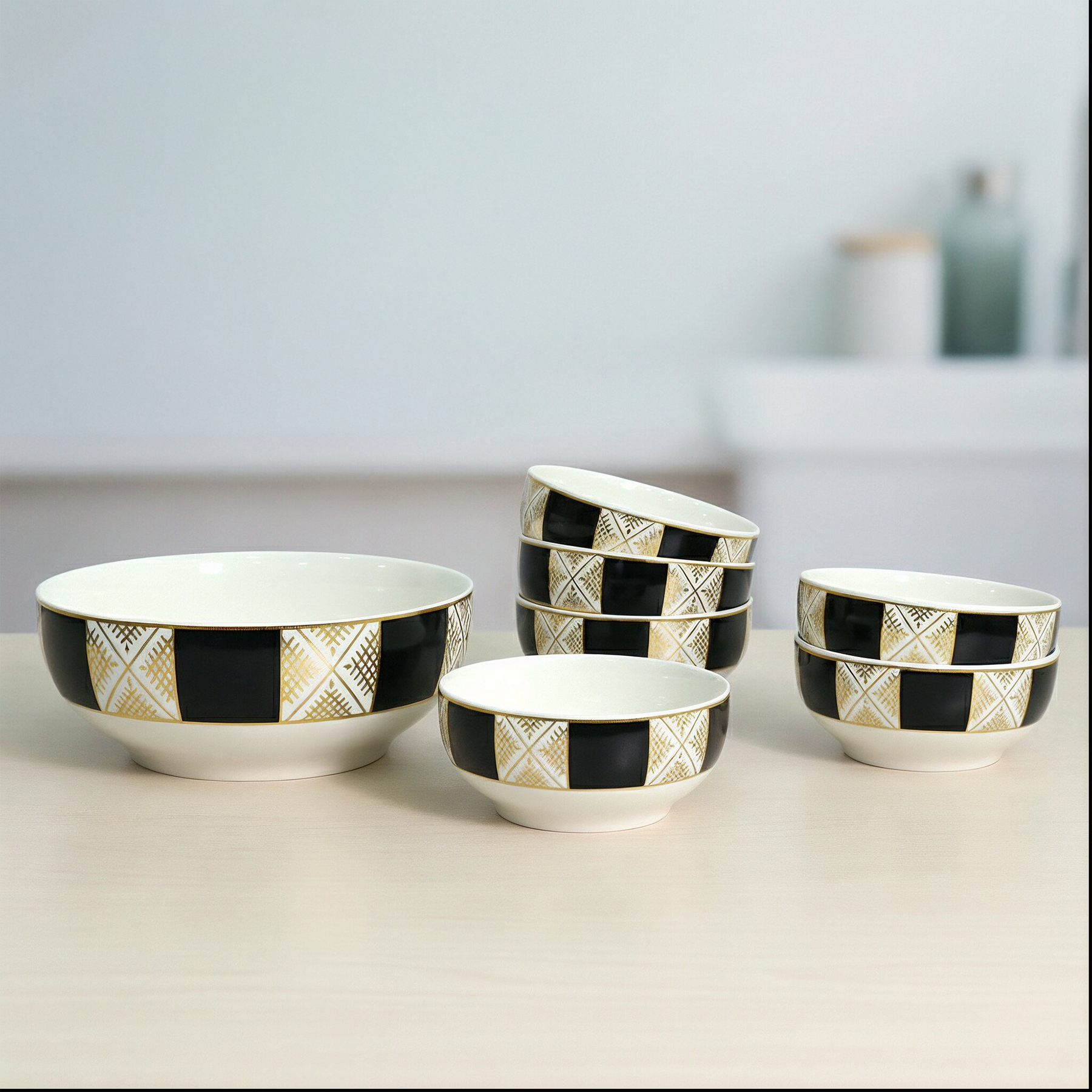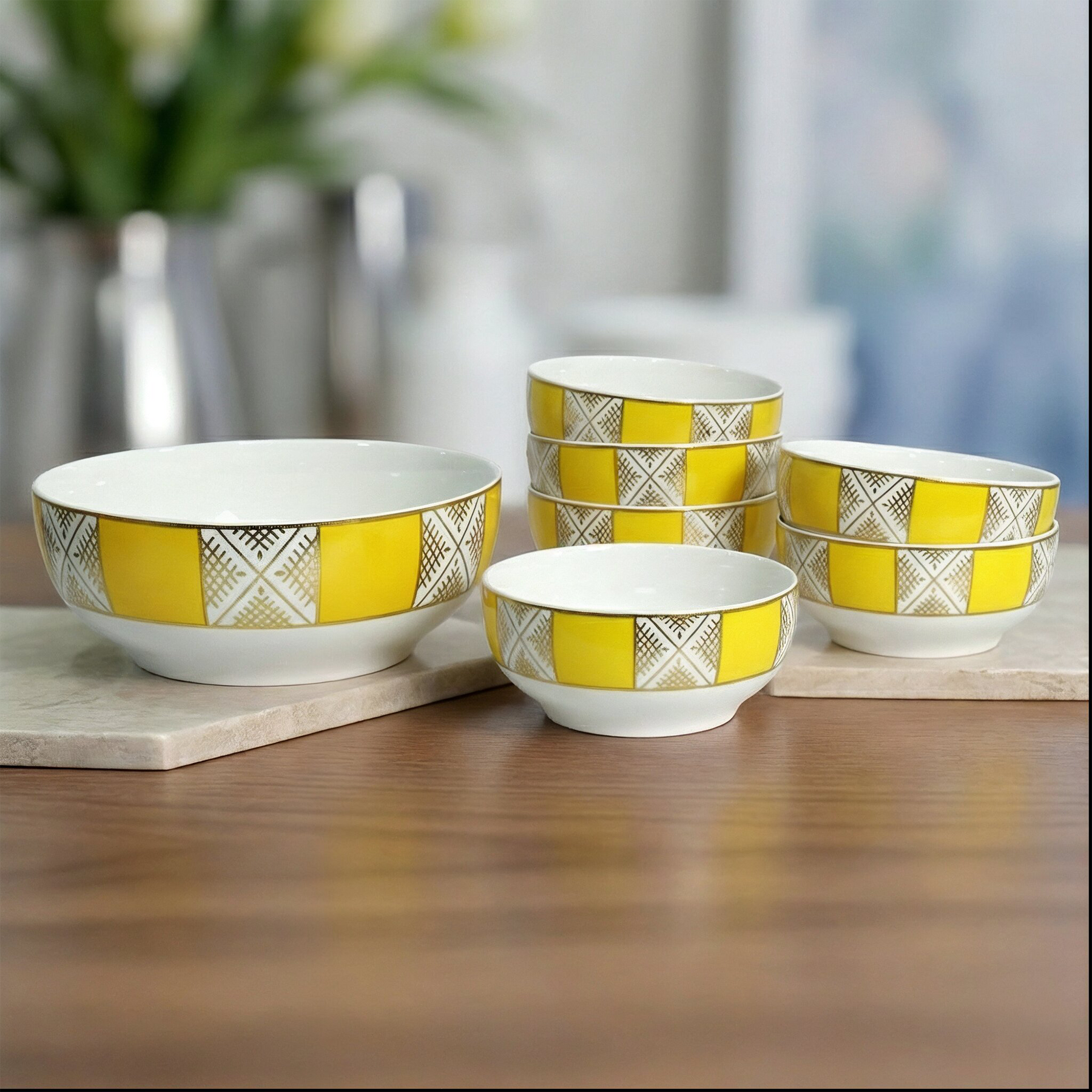 Ajoutez une touche artisanale à vos repas avec ce set composé d'un saladier et de six bols en céramique aux motifs beldi traditionnels.