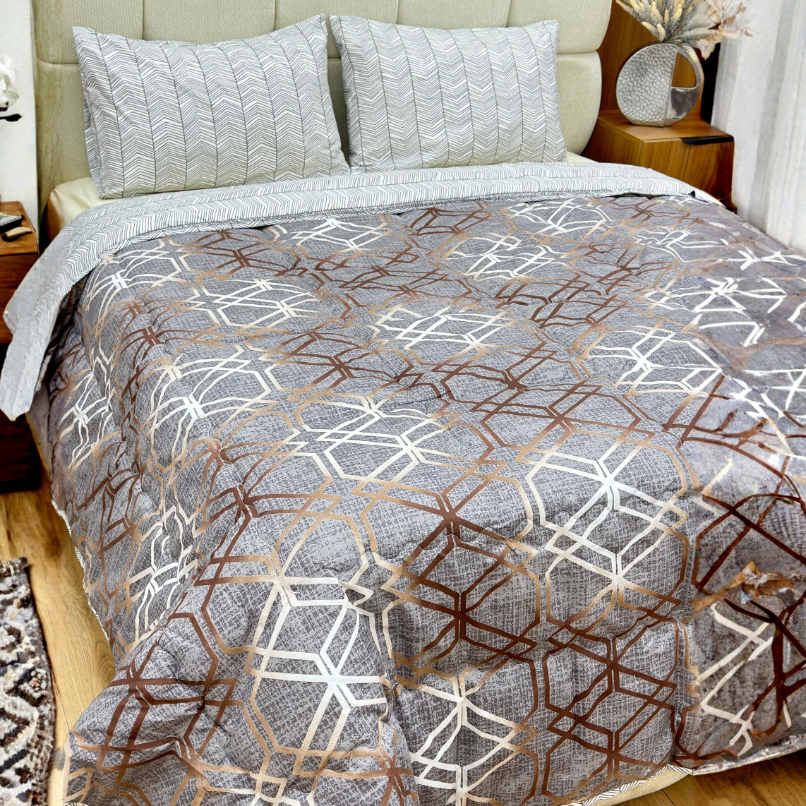 - Motif : Design géométrique dans des tons de gris et de marron, s'adaptant à divers styles de décoration.