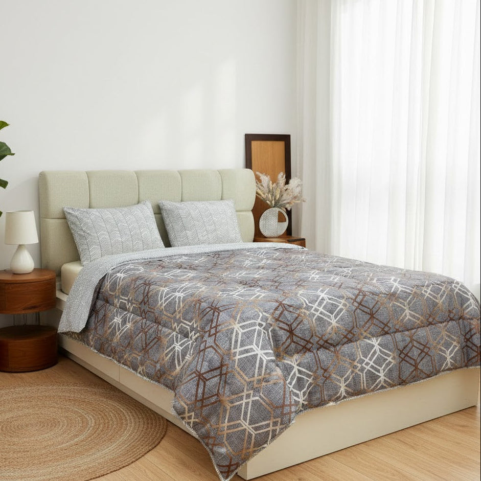 Ce couvre-lit spacieux de 235x235 cm, accompagné de deux taies d'oreiller de 50x70 cm, est fabriqué en microfibre, offrant douceur et confort. Son design moderne avec des motifs géométriques est parfait pour apporter une touche chaleureuse à votre chambre.