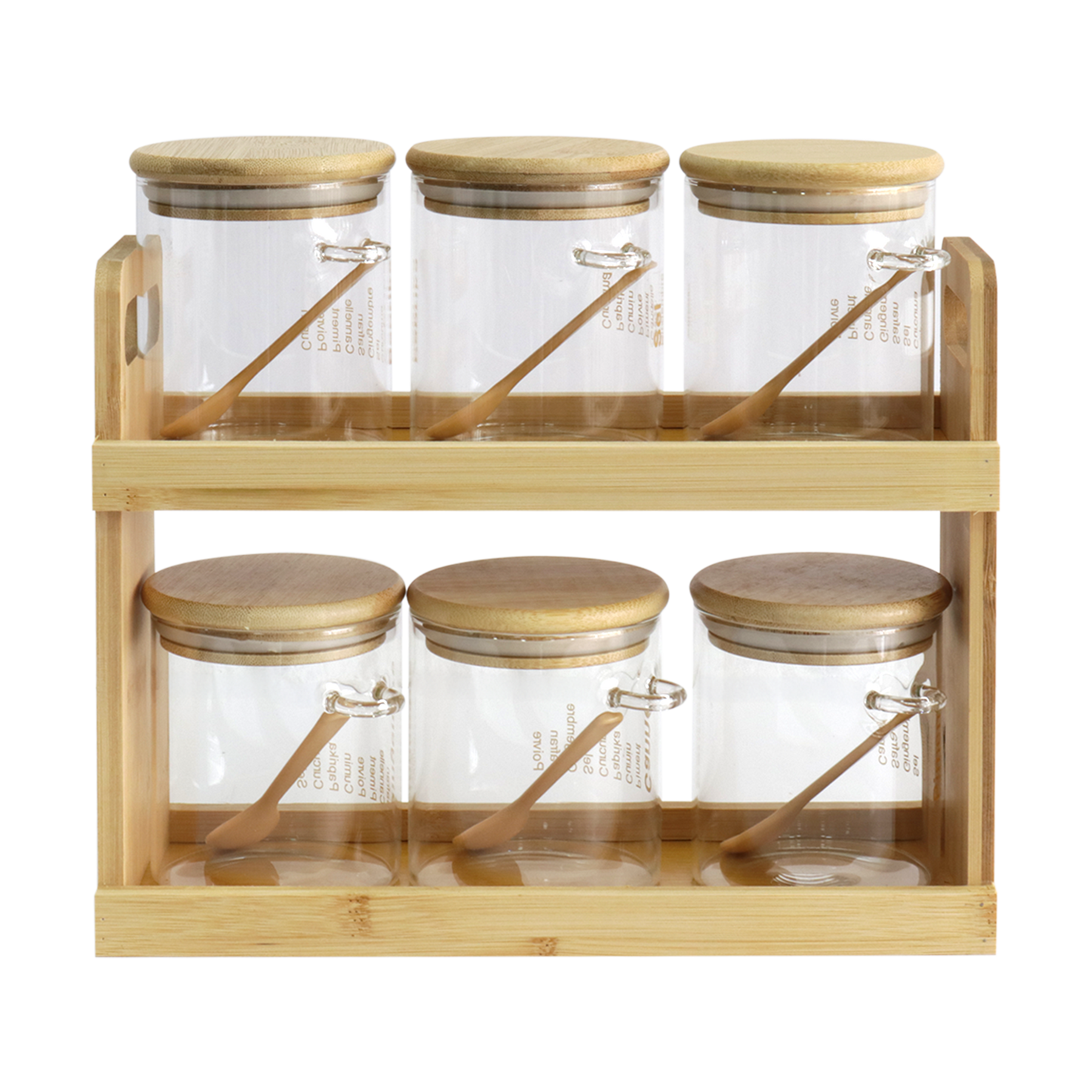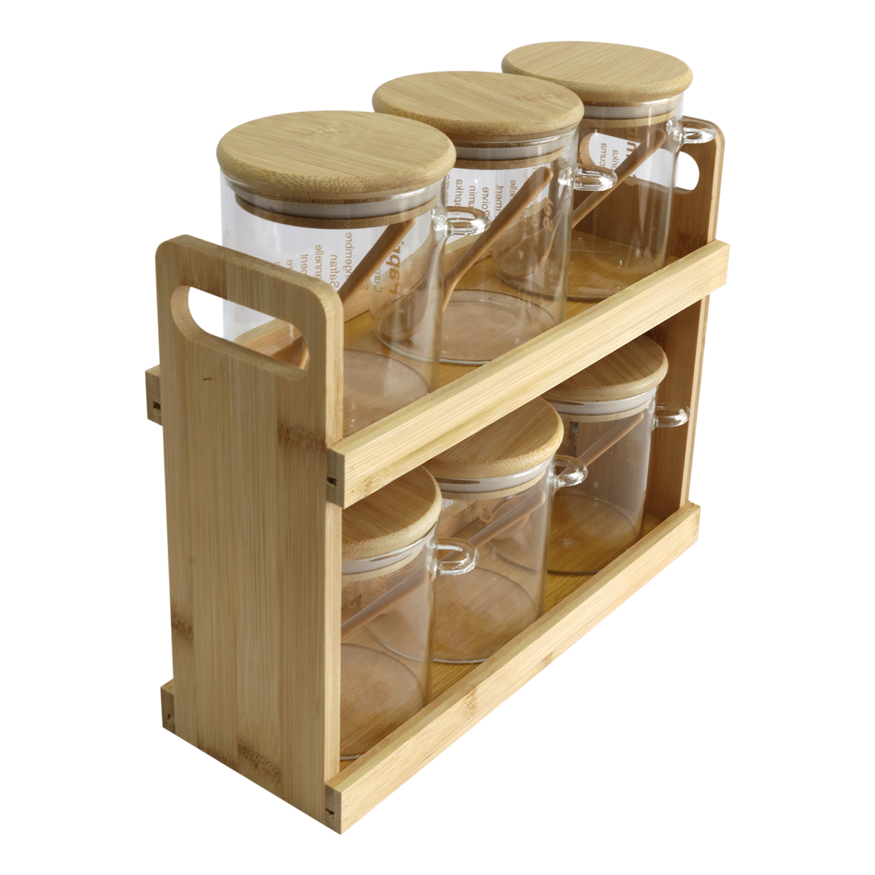 - Il comprend 6 bocaux en verre 8x10cm avec couvercles en bois, 6 cuillères en plastique assorties et une étagère en bois à 2 niveaux 28x21cm .