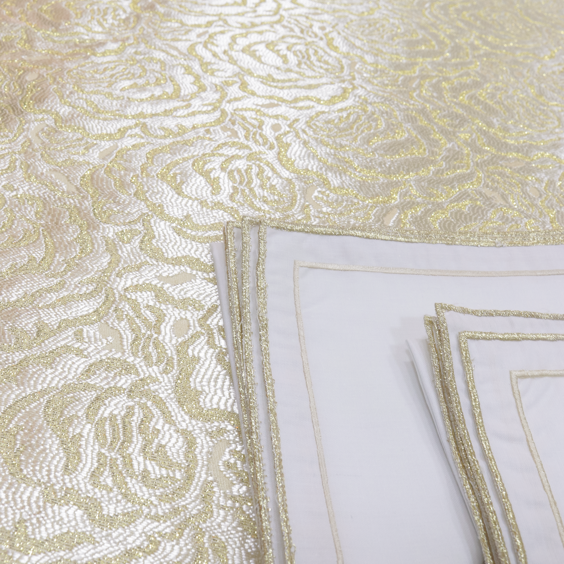 • La nappe en brocard offre une texture luxueuse, tandis que les serviettes ajoutent confort et sophistication.