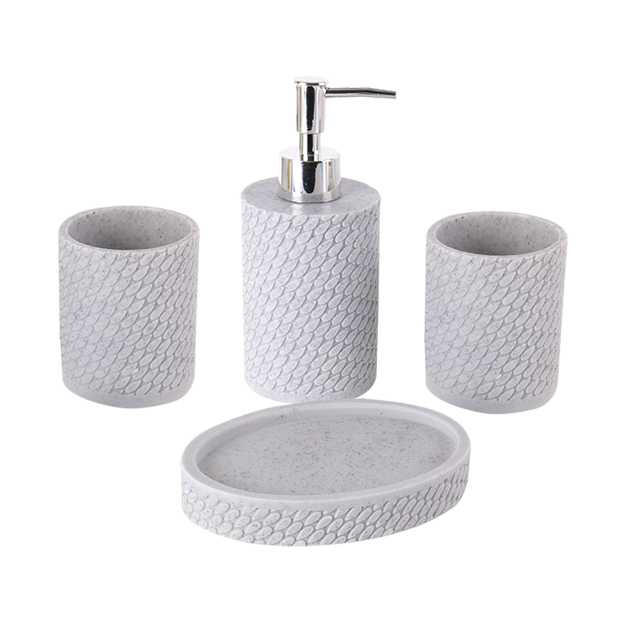 - Il comprend un distributeur de savon (17,50 x 7 cm), un porte-savon (14 x 9.50 cm), un verre (9 x 7 cm) et un porte-brosse à dents (9 x 7 cm).