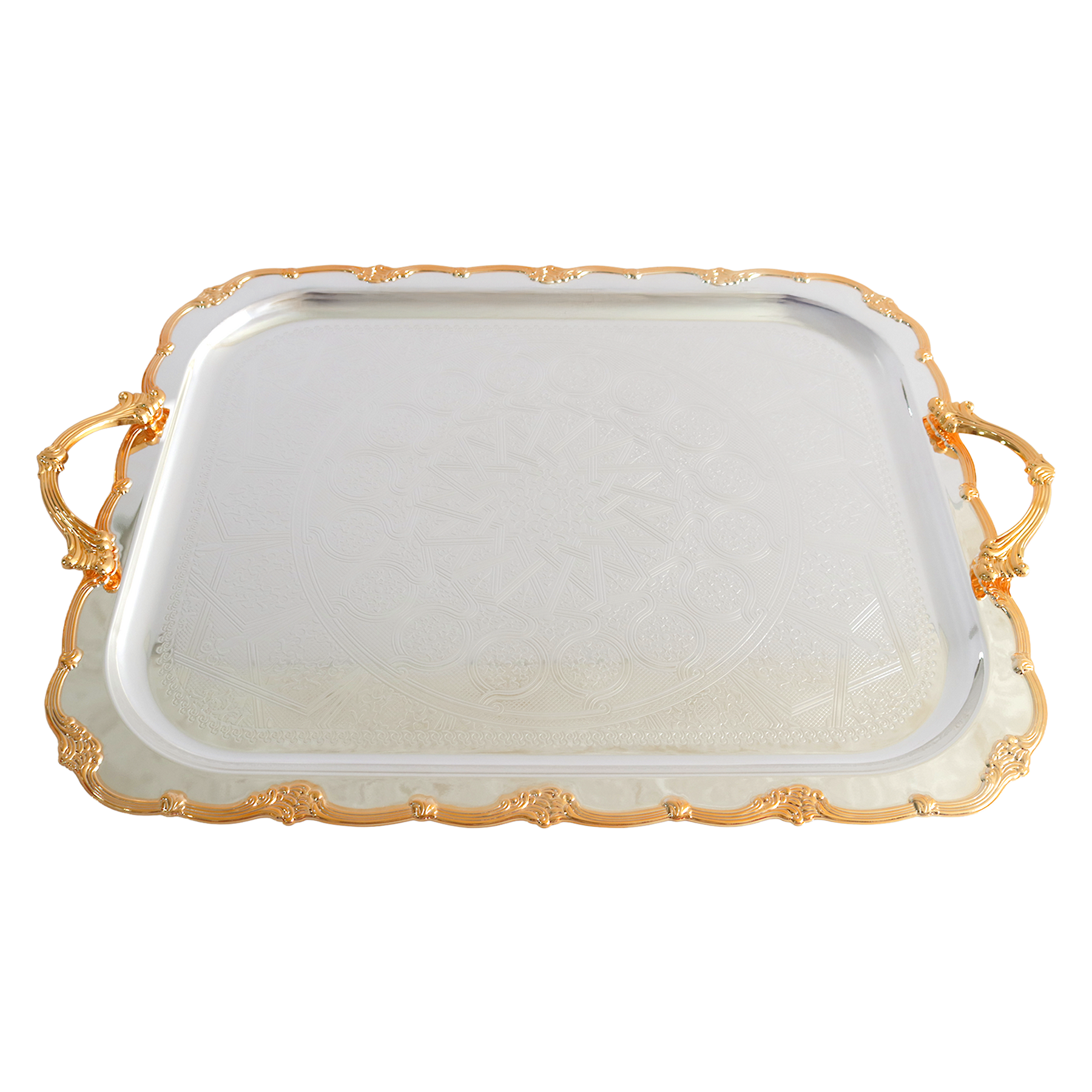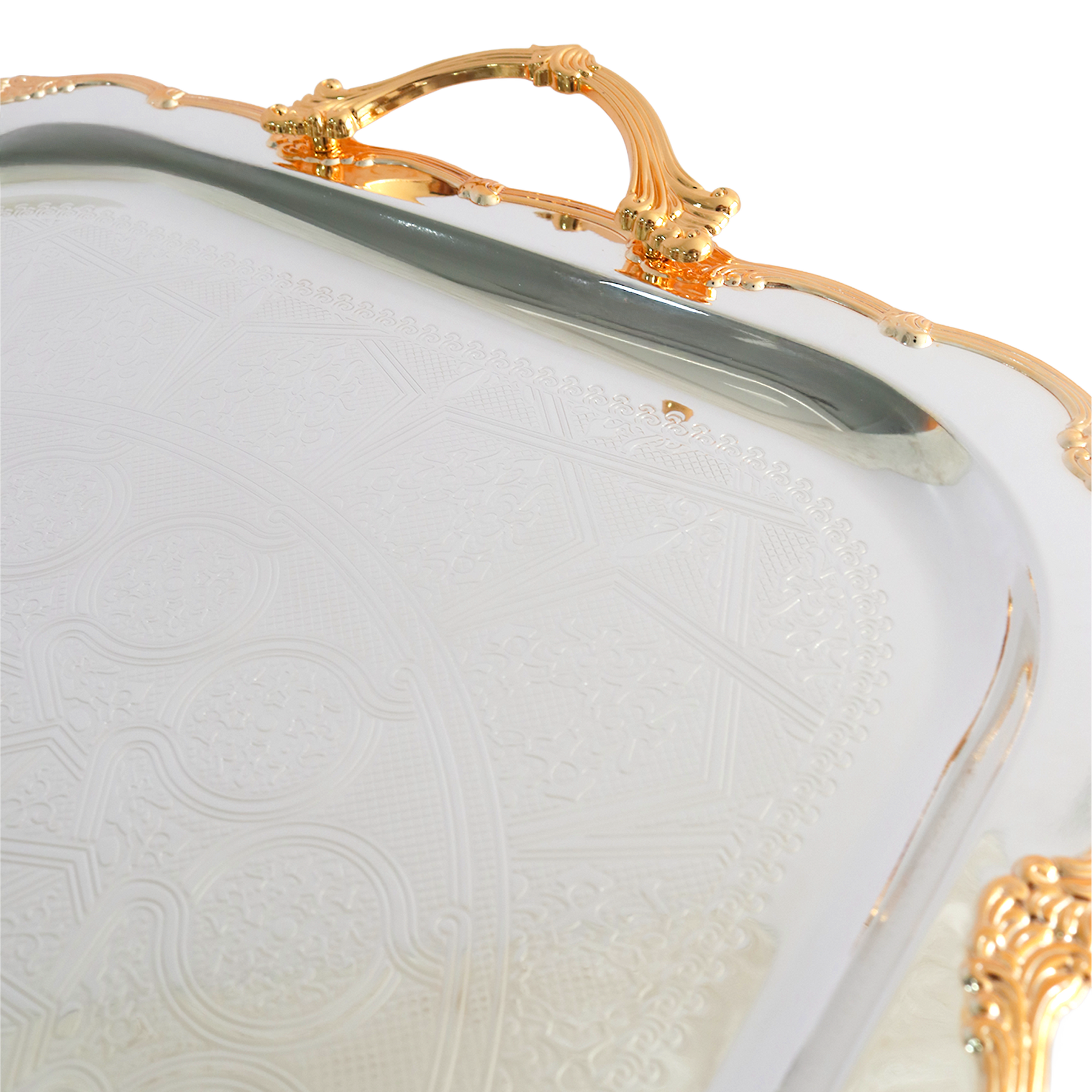 Découvrez notre plateau rectangulaire en métal argenté et doré, alliant élégance et fonctionnalité :